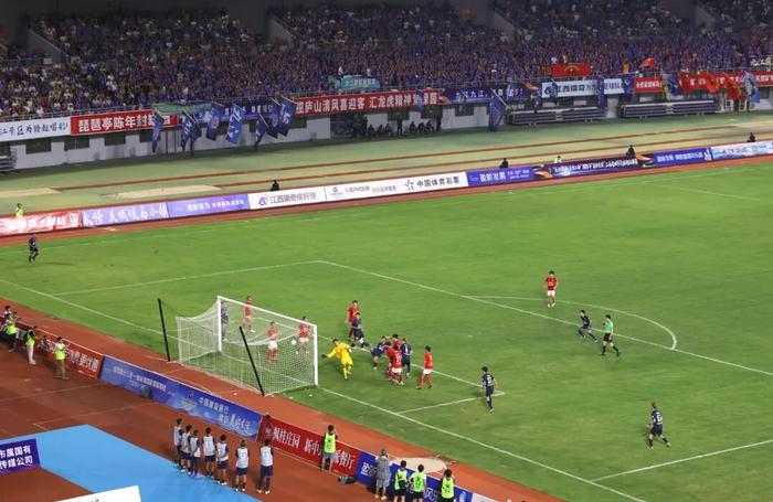 56分钟,殷世贤右路带球突破造成对方犯规,九江队获得前场定位球,鹰潭队解围不远,63号章宇涛利用二次进攻在禁区前低射破门,比分3:0。