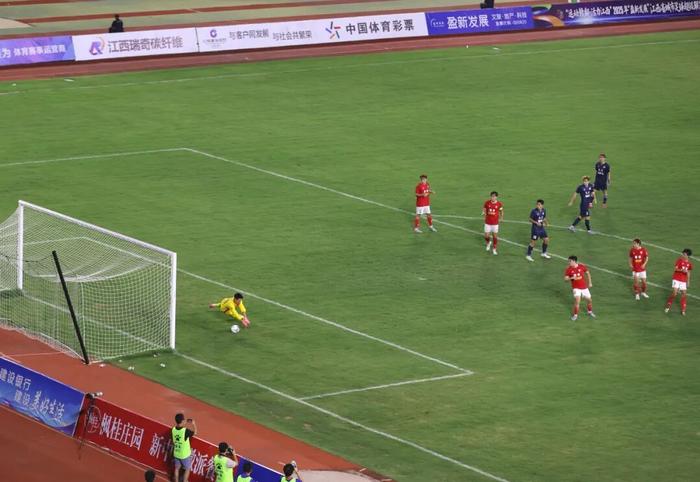 比赛第27分钟,鹰潭队后场解围失误,九江队50号方亮禁区外精彩吊射破门,比分2:0。
